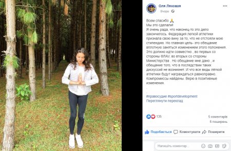 - Всім дякую! Ми це зробили! Я дуже рада, що нарешті ця справа закінчилася. Федерація легкої атлетики визнала свою провину за те, що не відстояли мою стипендію. Але головна мета - це обіцянка впритул зайнятися зміною цього положення. Це повинно йти спільно, по-перше, з боку ФЛАУ, по-друге, з боку Міністерства. Але обіцянка мені дана, і обіцянка того, що згодом таких дискусій не виникне. І що всі види легкої атлетики будуть нагороджуватися рівноправно. Компроміси знайдені. Вірю в позитивні зміни. – поділилася Ольга Ляхова.