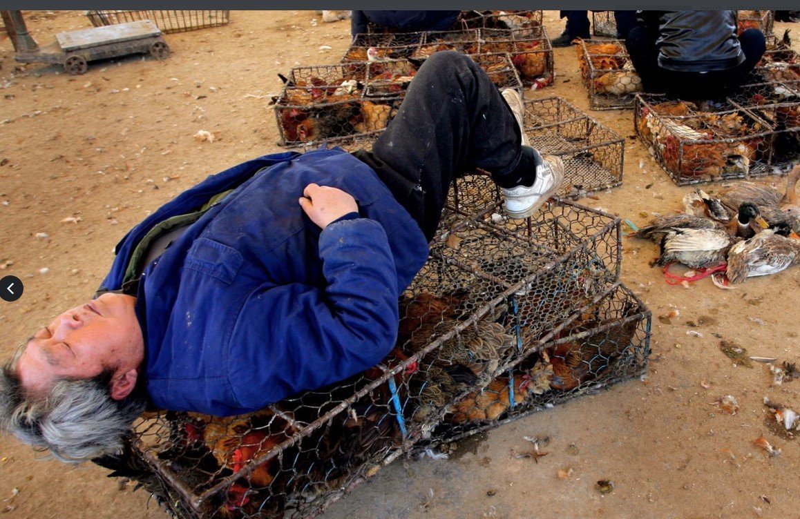 Усталый продавец спит на клетках с птицей на рынке в Нанкине (фотогалерея Радио Свобода)