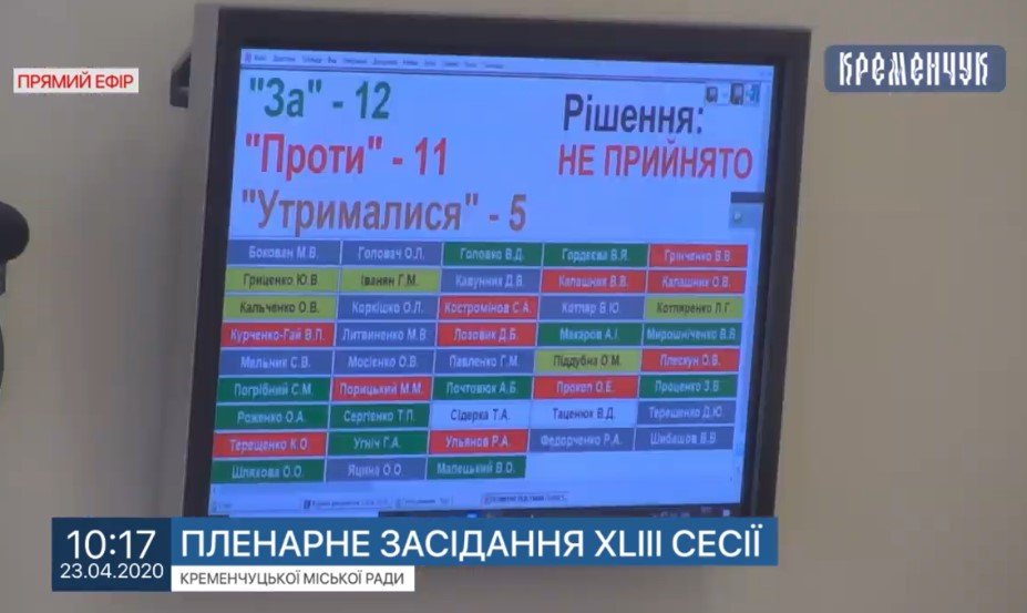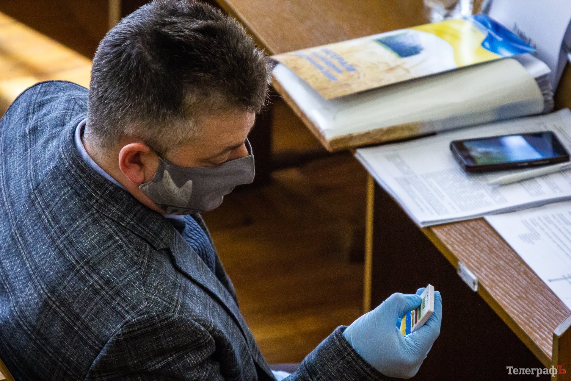 23 квітня депутати Кременчуцької міської ради зібралися на сесію, яка проходить у карантинному режимі. Вони сидять у масках та через два стільця один від одного, дотримуючись соціальної дистанції.