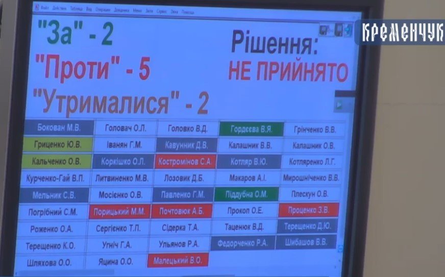 Мэр предложил голосовать. Депутаты проголосовали: предложение Пиддубной поддержали двое – она сама и депутат Гордеева. Воздержались секретарь горсовета Гриценко и депутат Кальченко. Против голосовали пятеро – Малецкий, Порицкий, Проценко, Почтовюк, Костроминов. Остальные депутаты в голосовании не участвовали, хотя в зале было 43 депутата.