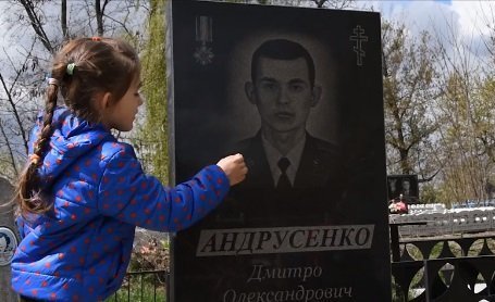 Дівчинка ніколи не бачила татка, адже народилася вже після смерті Дмитра. Маленька своїми рученятами обіймає портрет тата на кладовищі – вона розуміє, що він на небі, але, повернувшись додому, все одно чекає на нього.
