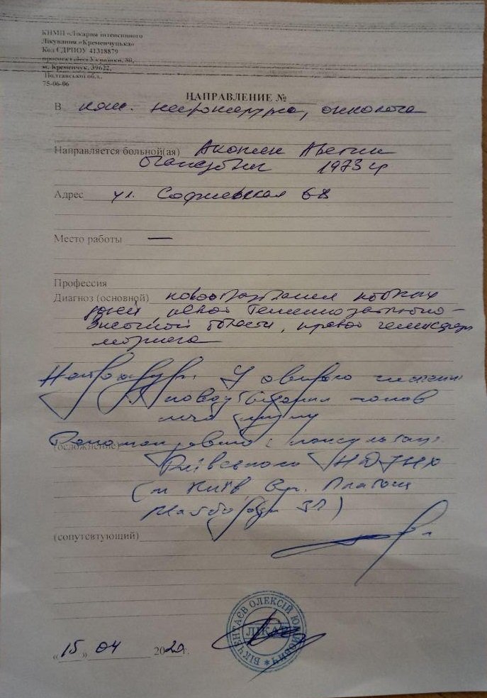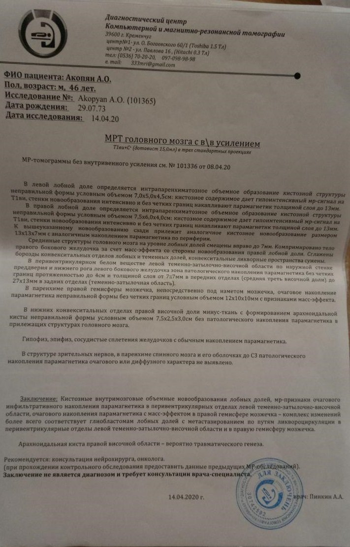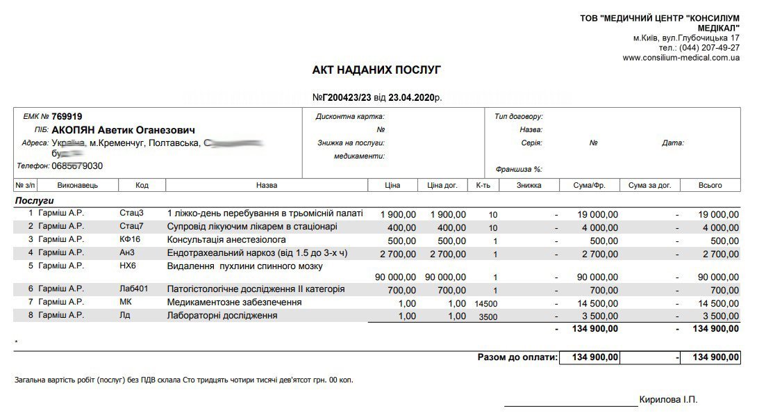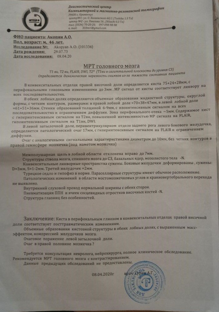 Кременчужанину Аветику Акопяну (1973 г. р.) необходима помощь на проведение операции по удалению опухоли мозга. По словам дяди, Анушавана Степаняна, Аветик в апреле стал жаловаться на головные боли, а после проведения МРТ-диагностики стало ясно, что у него опухоль. Кременчугские врачи сразу сказали, что необходимо обращаться в Киев. В Киеве семье выставили счёт на 134,9 тыс грн.