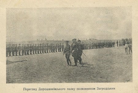 Запорізька дивізія (близько 8 тисяч багнетів) прибула на фронт під Яготин на Київщині, де з’єдналася з німецькими частинами. Перший бій минувся для українців без втрат, хоча довелося витримати шалений кулеметний вогонь ворожого бронепотягу. «Старі козаки лежали й одстрілювались, а молоді гімназисти, що записалися в Київі, поховали голови в окопчики і не дихали, – свідчив очевидець. – Один тільки командир сотні, сотник Кириченко, стояв у повний зріст, кричав на молодих, щоб не ховали голів, і жартував на кожний вибух гармати».