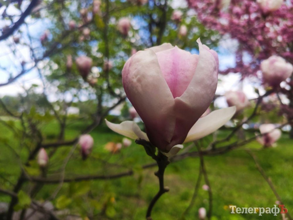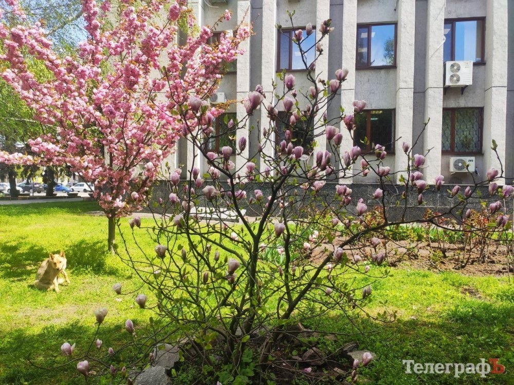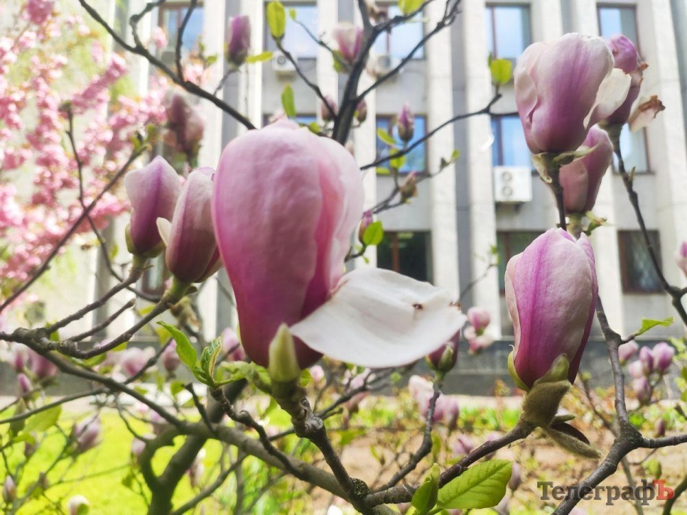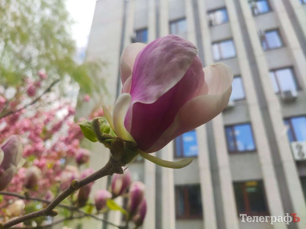 Під стінами Кременчуцької міської ради заквітла магнолія. Дерево з рожевими квітами можна знайти праворуч від входу до будинку мерії. Цей кущ трохи із запізненням розквітає.