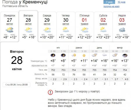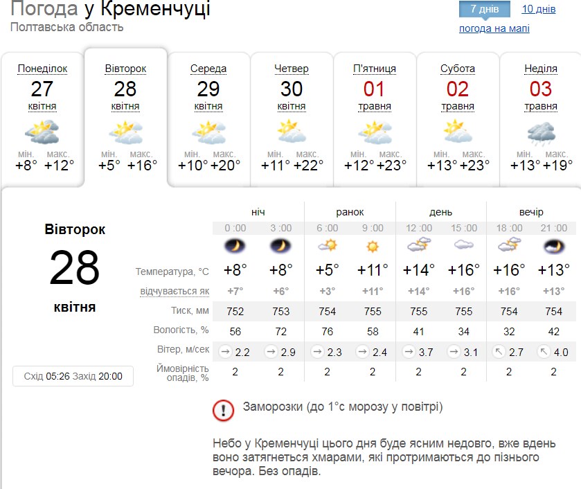 Про заморозки до -1°С у повітрі кременчужан попереджає також Sinoptik.