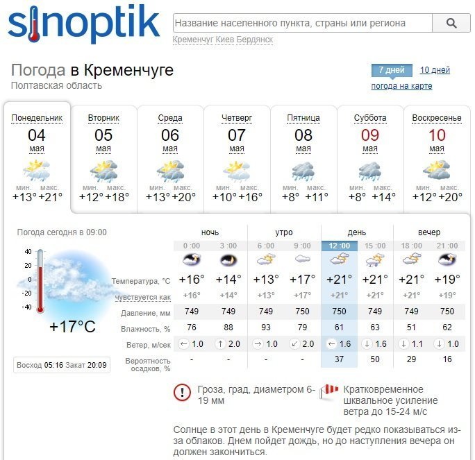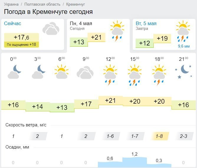 Синоптики предупреждают, что 4 мая во второй половине дня в Кременчуге начнётся гроза, кроме того, на город может посыпаться град диаметром 6-19 мм.
