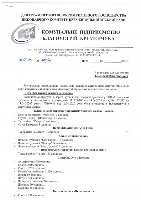 Не побачили ми й найбільш дороговартісних дерев (див. вище три найменування) серед переліку того, що вже висаджено у парках, скверах тощо. Крім того, керівництво КП «Благоустрій Кременчука» фактично підтвердило, що не має документального обгрунтування необхідності закупівлі дороговартісних дерев. Нам відповіли, що «запитувана інформація не відповідає критеріям відображеності та задокументованості, так як її необхідно створити шляхом обробки та узагальнення додаткових даних».