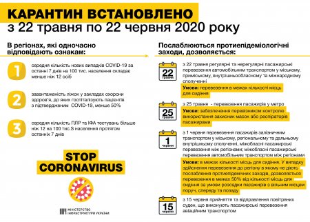 Крім цього, з 1 червня почнуть здійснюватися міжобласні пасажирські перевезення автомобільним транспортом. Проте, якщо це перевезення до регіону, в якому не діють послаблення протиепідемічних заходів, дозволяється перевезення в межах 50% від кількості місць для сидіння за умови розсаджування пасажирів з вільним місцем поруч, спереду та позаду.