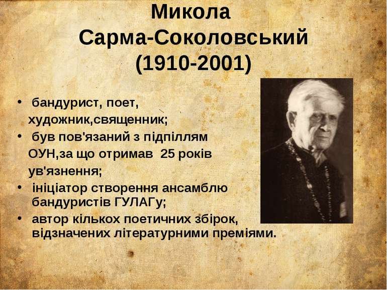 «Його життя – сюжет для великого роману, за його біографією можна зняти драматичний фільм. Це людина незламної волі, великої віри в незалежність України. Настав час повернути це ім’я в історію», - так письменниця з м. Дніпро Леся Степовичка відгукнулася про свого земляка - художника, кобзаря, поета, священика УАПЦ, правозахисника, учасника підпілля ОУН, політв`язня комуністичних концтаборів Миколу Сарму-Соколовського. З ініціативи Українського інституту національної пам’яті 110-та річниця з дня його народження відзначається на державному рівні згідно з Постановою Верховної Ради про пам’ятні дати та ювілеї у 2020 році. Тож сьогодні розповімо про цього яскравого діяча національно-визвольного руху.
