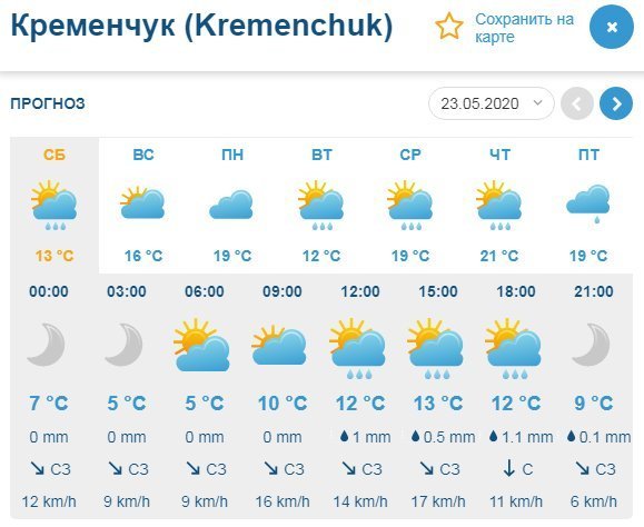 А вот Gismeteo прогнозирует небольшой дождь на протяжении всех выходных дней. Столбики термометров кременчужан покажут от +7°С до всего +14°С.