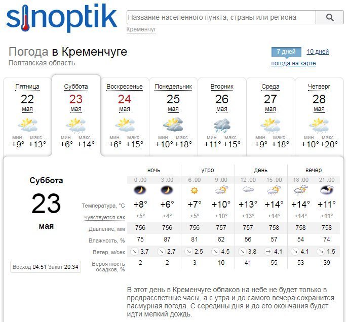 Конец мая особо не отличается тёплой погодой – вот и на этих выходных в Кременчуге будет достаточно прохладно, кроме того, синоптики сообщают о мелком дожде и сильном ветре в городе.