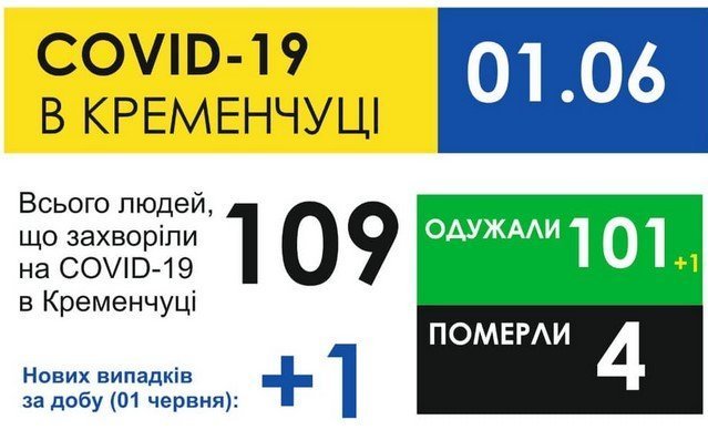 Руководитель кременчугского управления здравоохранения Максим Середа сообщил, что всего с 29 мая по 1 июня в Кременчуге подтвердились два случая COVID-19. Оба пациента кременчужане, мужчины, оба поступили в инфекционное отделение больницы «Кременчугской» с пневмониями. По обоим подтвердилось подозрение на коронавирусную инфекцию и теперь их в стационаре лечат от вирусных пневмоний (пневмонии коронавирусного происхождения).
