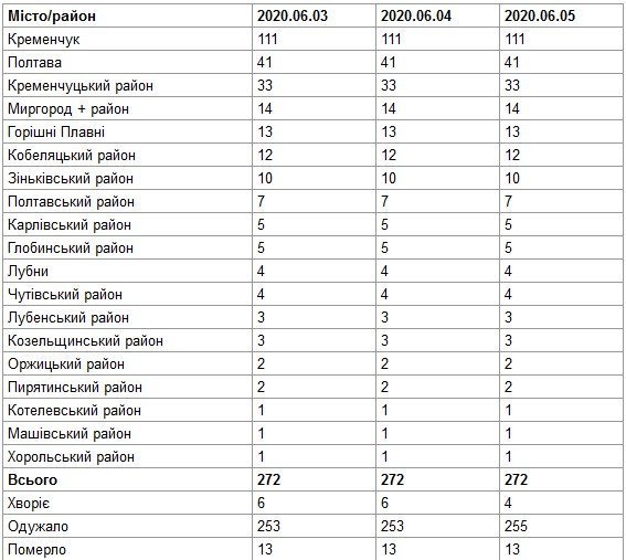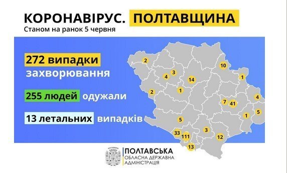 По данным Полтавской областной администрации, по состоянию на 5 июня в Кременчуге зарегистрировано 111* случаев COVID-19, в Полтаве – 41, в целом же по области – 272.