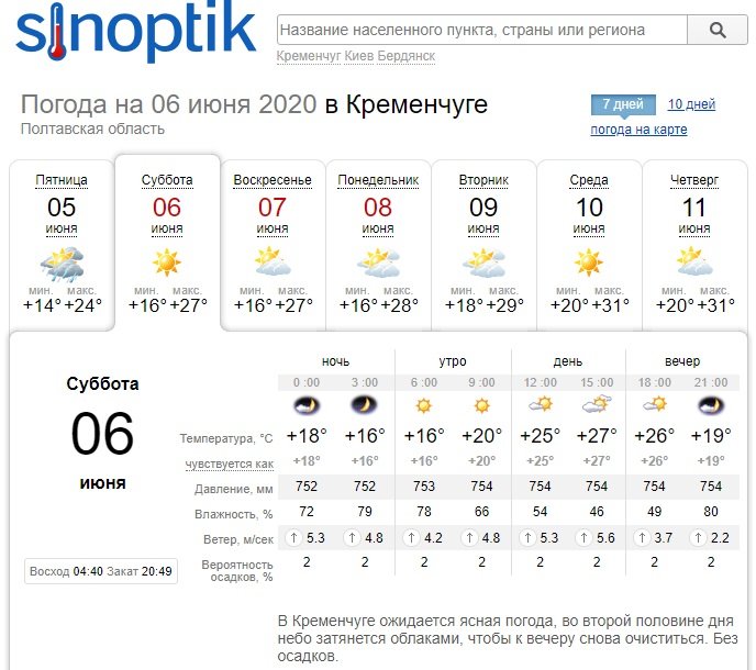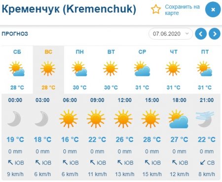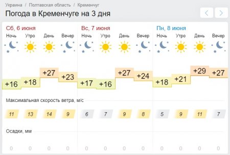 Что касается Ventusky, этот погодным портал обещает переменную облачность на протяжении всего уикенда, но осадки не потревожат кременчужан, давая им возможность как следует отдохнуть вне дома и насладиться прогулками в ближайшие три выходных. Что касается температурных показателей, они будут колебаться от +16°С до рекордно жарких +30°С.