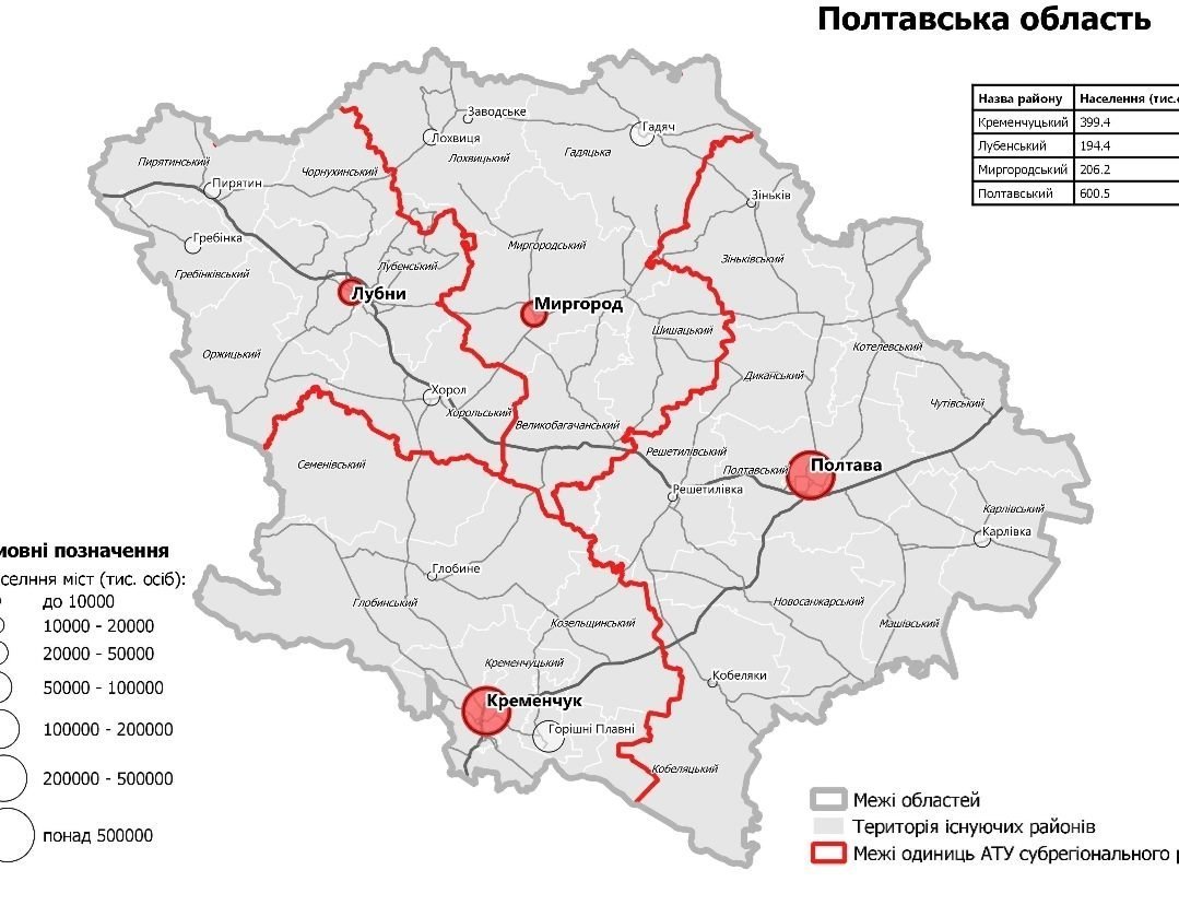 Відповідно до карти, опублікованої на сайті Полтавської ОДА, найбільшим районом буде Полтавський. Він налічуватиме 600,5 тисяч жителів. На території Кременчуцького району житиме 399,4 тисячі людей, у Лубенському – 194,4 тисячі людей, а в Миргородському – 206,2 тисячі людей.
