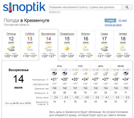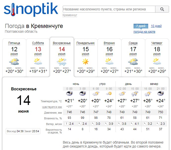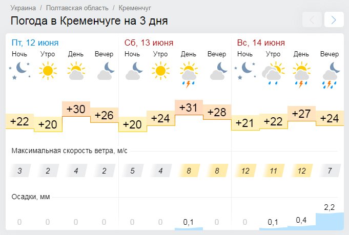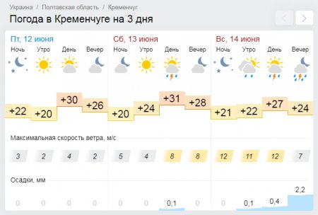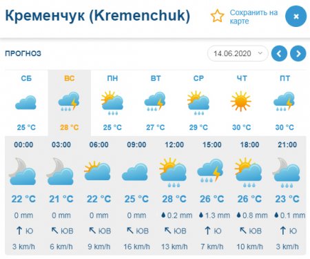 Ventusky даёт похожий прогноз: во второй половине дня в воскресенье, 14 июня, в Кременчуге пройдёт дождь с грозой. В субботу, 13 июня, в городе будет сухо. Минимальные температурные показатели составят +20°С, а максимальные «доползут» до жарких +34°С.