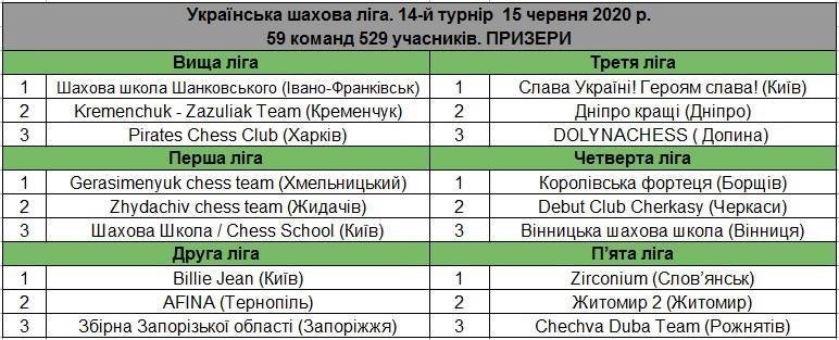 Зауважимо, що в 14 турнірі Української шахової ліги змагалися 59 команд в складі яких виступали 529 учасників. У змаганнях серед команд Вищої ліги перемогу здобула «Шахова школа Шанковського» з Івано-Франківська для якої це був 7-й титул чемпіона УШЛ. Франківчани в запеклій боротьбі на 6 очок випередили команду Kremenchuk – Zazuliak Team з Кременчука, яка відповідно посіла друге місце. Третя сходинка дісталася команді Pirates Chess Club (Харків).