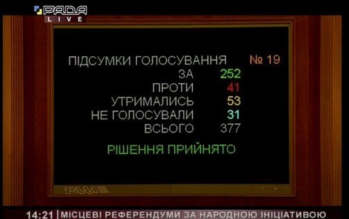 Сегодня, 18 июня, Верховная Рада приняла в первом чтении президентский законопроект № 3612 «Про народовладдя через всеукраїнський референдум”, 252 голоса «за».