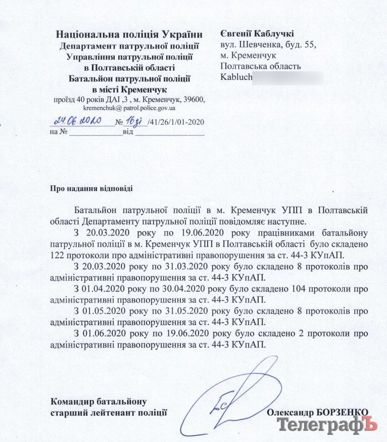 Згідно з відповіддю на запит, з 20 березня по 19 червня цього року кременчуцькі копи склали 122 протоколи за ст. 44-3 КУпАП.