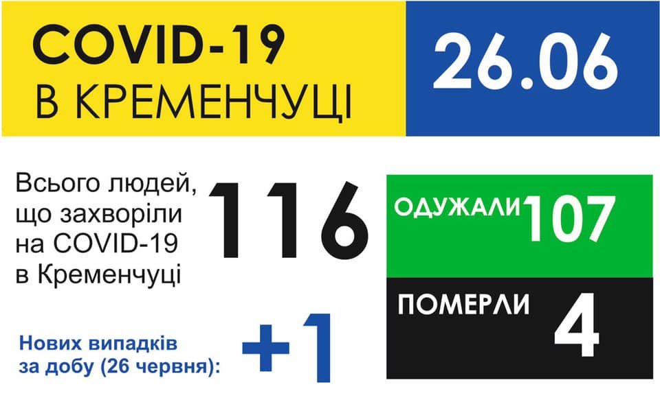 26 червня в Кременчуці зареєстрували один новий випадок коронавірусної хвороби. Як повідомив міський голова Віталій Малецький, позитивний ПЛР-тест виявився у жінки 78 років, яка перебувала в контакті з пацієнткою з раніше підтвердженим COVID-19.