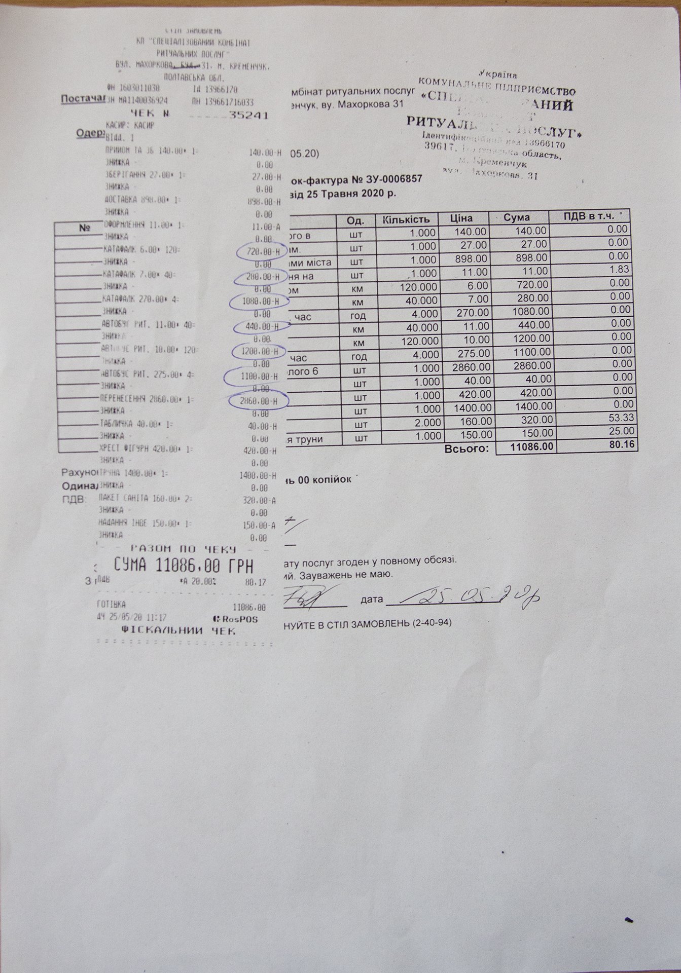 – У рахунку-фактурі № ЗУ-0006857, п.7 та п.10, зазначена вартість години використання катафалку та автобусу КП СКРП у робочий час. Замовники сплатили по цих позиціях 1080 грн та 1100 грн. Натомість у чеку до рахунку-фактури № ЗУ-0006858 зазначена оплата ще за один катафалк – 2583 грн. Згідно прайсу КП СКРП, п. 34, це оплата за катафалк-автобус у неурочний час. Скаржники Дяченки стверджують, що поховання відбулося у робочий час, о 13 годині. І перші дві одиниці техніки СКРП (катафалк та автобус) працювали теж у робочий час. Які функції виконував катафалк-автобус у селі Великі Кринки у неурочний час? Чи приїздив він у село? Якщо так, просимо надати на підтвердження копії маршрутних листів.