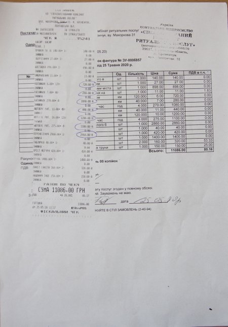 – У чеку до рахунку-фактури № ЗУ-0006858 вказано, що за перенесення труни замовники заплатили КП СКРП 3820 грн. Згідно з прайсом КП СКРП, це вартість пересення труни у вихідні та світкові дні (п.46). Але Дяченко Л.А ховали у понеділок, 25 травня. Чому з замовників КП СКПР узяв гроші за поховання у вихідні дні? Чому замовників змусили двічі заплатити за перенесення тіла – 2860 грн та 3820 грн.?