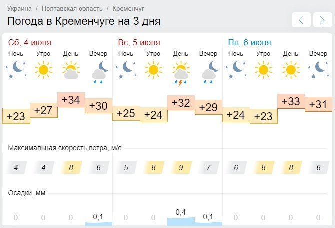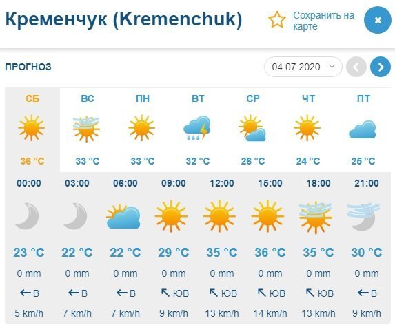 За даними Ventusky, на вікенд Кременчук накриє хвиля спеки: стовпчики термометрів покажуть від +21°С до рекордних +36°С. Крім того, у місті буде ще й вітряно – наприклад, у неділю, 5 липня, сила вітру досягне 17 км/годину. Без опадів.
