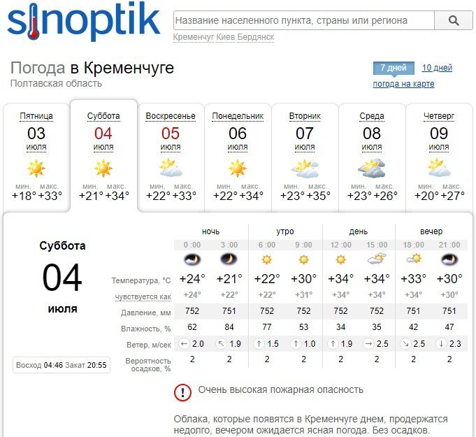 За інформацією Sinoptik, температурні показники на вікенд становитимуть від +21°С до +34°С. Також цей погодний портал попереджає про високу пожежну небезпеку у суботу, 4 липня, тож будьте обережні. Вихідні дні пройдуть без опадів, але у неділю, 5 липня, увесь день зберігатиметься хмарна погода.