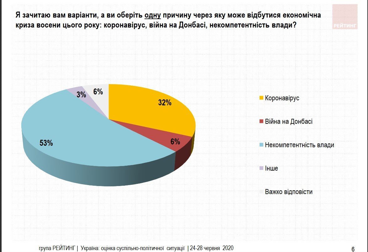 Группа Рейтинг опубликовала результаты последнего социологического исследования, проводившегося 24-28 июня. Социологи задали украинцам такой вопрос: как вы думаете, по какой причине в Украине осенью может произойти экономический кризис – из-за коронавируса, из-за войны на Донбассе, из-за некомпетентности власти?