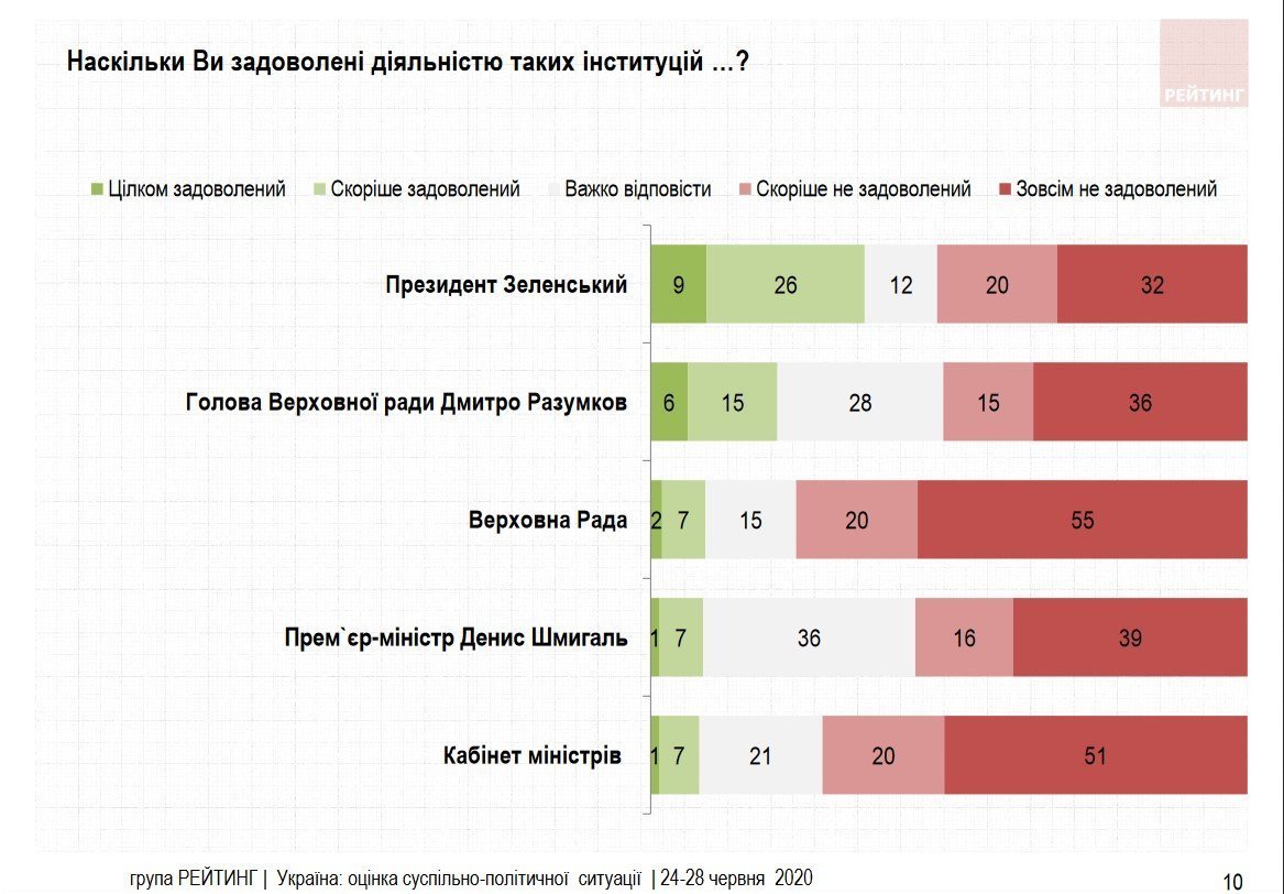 Показатели по Верховной Раде и в декабре 2019-го были неблестящими – её работой уже были недовольны 51% украинцев, а довольны – 29%. По данным июньского исследования 2020 года, довольных работой ВРУ осталось 9%.