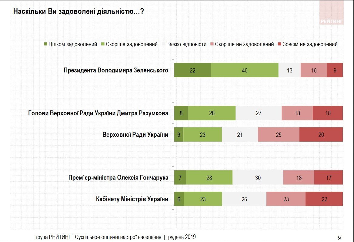 В декабре 2019-го 62% респондентов были довольны работой президента Зеленского, и лишь 25% были недовольны.