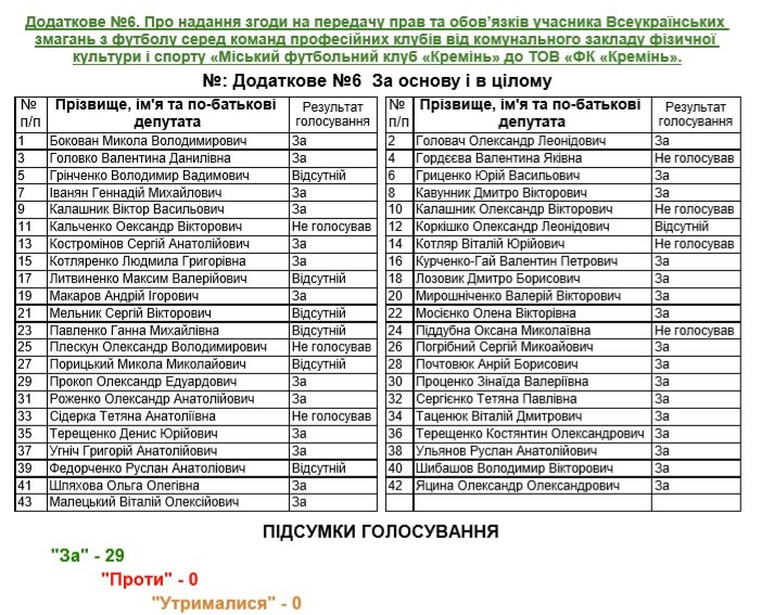Для цього уповноважать директора комунального закладу фізичної культури і спорту «Міський футбольний клуб «Кремінь» Андрія Недяка укласти та підписати договір з ТОВ «ФК «Кремінь» про передачу прав та обов'язків учасника Всеукраїнських змагань з футболу серед команд професійних клубів.