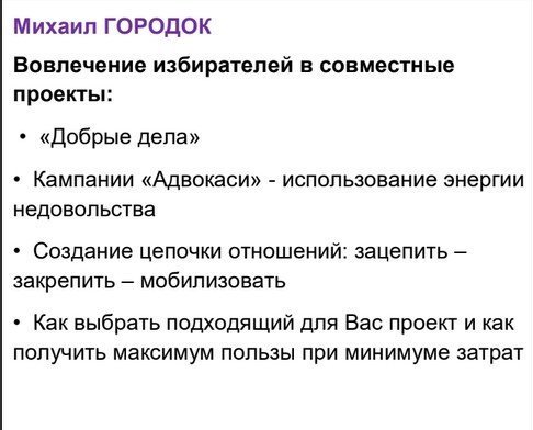 «Телеграф» очень заинтересовал блок «Добрые дела» – те самые, на которые так клюют избиратели. Семинар вел Михаил Городок. Там был вот такой потрясающий раздел – «Как выбрать подходящий для вас проект и как получить максимум пользы при минимуме затрат».