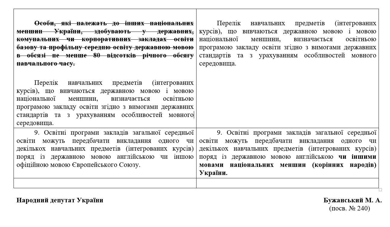 Народний депутат Володимир В’ятрович зазначив, що в разі прийняття закону, перехід учнів 5-11 класів росіи?ськомовних шкіл на украі?нську мову навчання з 1 вересня 2020 буде скасовано.