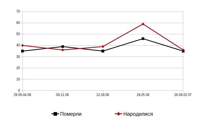 Но каждую неделю в июне, за исключением 05.06-11.06, кременчужан рождалось больше, чем умирало. В частности, с 19 по 25 июня, когда умерло 46 человек, родилось 59.