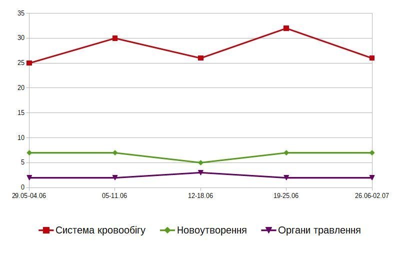 На втором месте по количеству летальных исходов стоят онкологические заболевания (злокачественные новообразования). 29.05-04.06 от них умерли 7 кременчужан; 05.06-11.06 – 7; 12.06-18.06 – 5; 19.06-25.06 – 7; 26.06.-02.07 – 7.