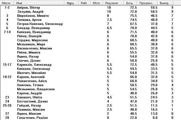 19 июля в Кременчуге состоялся открытый чемпионат по быстрым шахматам. Турнирную таблицу, иллюстрирующую результаты соревнования, опубликовал в Фейсбуке тренер по шахматам Андрей Зазуляк.
