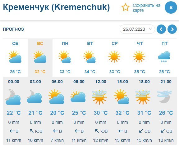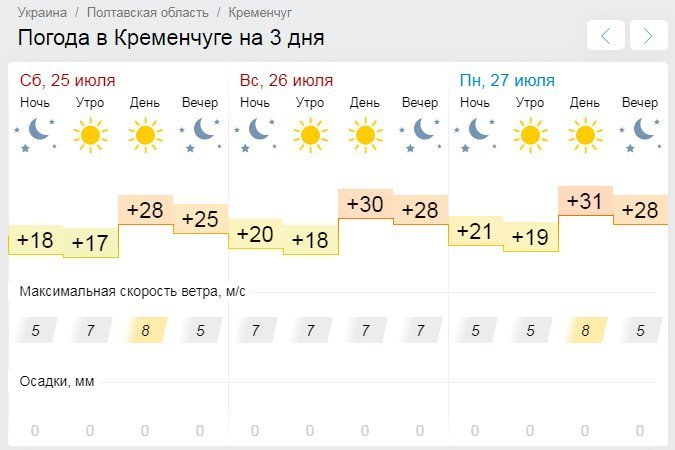 По прогнозам Gismeteo, весь уикенд в Кременчуге продержится солнечная погода, не стоит ждать ни дождей, ни даже облаков на небе. Что касается температурных показателей, они будут колебаться в пределах от +17-18°С по утрам до +30°С днём.