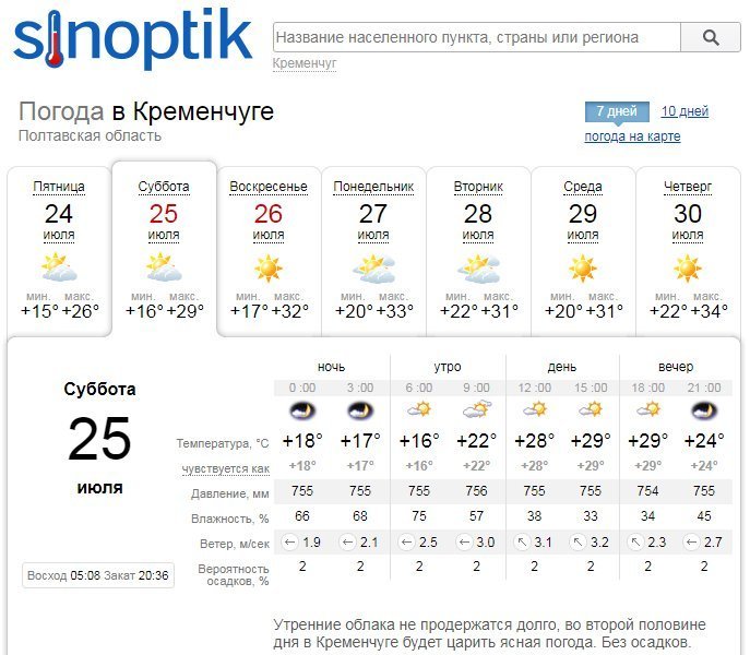 Sinoptik сообщает, что с утра в субботу, 25 июля, на кременчугском небе появятся облака, но скоро они рассеются – после этого в городе будет солнечно все выходные. На термометрах увидим от +16°С до +32°С.