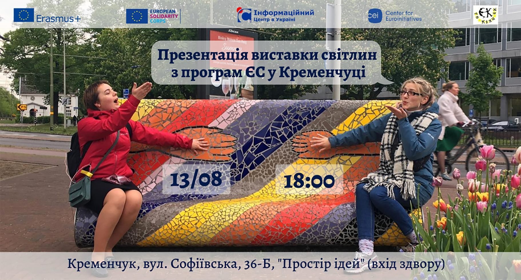 13 серпня о 18.00 у Кременчуці презентують виставку світлин з проєктів Erasmus+ Молодь та Європейський корпус солідарності. Захід відбудеться у «Простір ідей» (вхід здвору) вул. Софіївська, 36-Б.