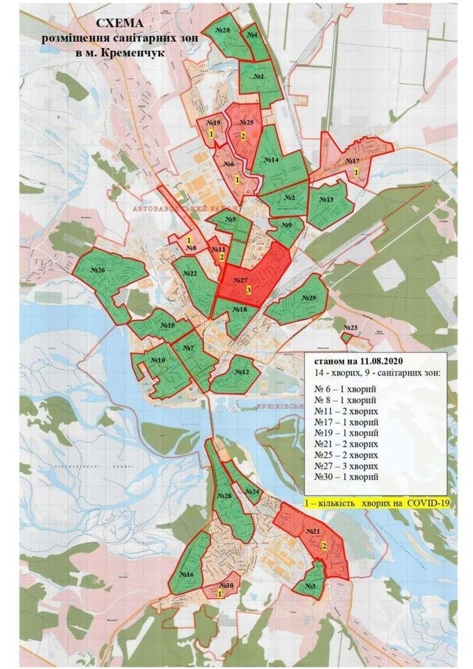 На сьогодні у Кременчуці діє 9 санітарно-карантинних зон. За інформацією управління з питань НС і ЦЗН виконкому Кременчуцької міської ради, 11 серпня прийняте рішення про відновлення санітарної зони №6 в районі проспекту Лесі Українки. В цілому, на сьогодні у Кременчуці діє 9 санітарно-карантинних зон.