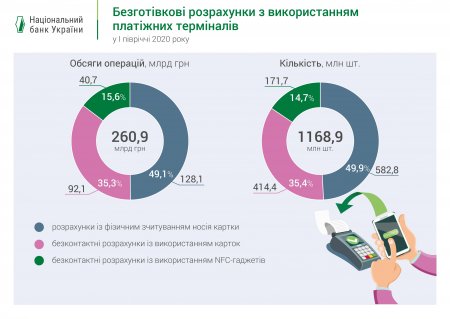 Безготівкові операції у першому півріччі цього року продовжили зростати за кількістю та сумою. Їх частка переважала у загальній сумі та кількості операцій із платіжними картками. Так, кількість безготівкових операцій становила 2 360,6 млн шт. (86,1% усіх операцій), а сума – 982,9 млрд грн. (55,1% від суми усіх операцій із картками). Торік, за підсумками першого півріччя, цей показник становив 49,4%.
