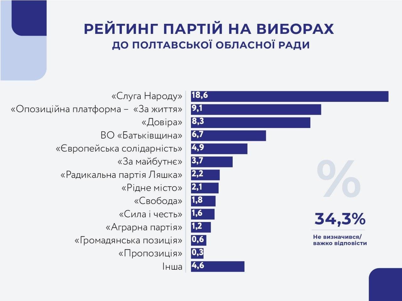 Так, високі шанси потрапити до обласної ради мають партії «Слуга народу», «Опозиційна платформа «За життя», «Довіра» та «Батьківщина». Впритул до прохідного бар’єру наближається «Європейська Солідарність» із 4,9%.