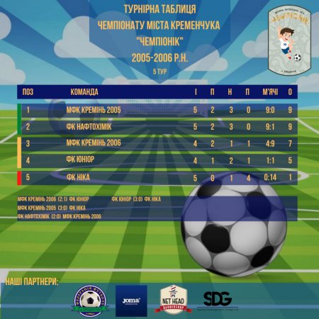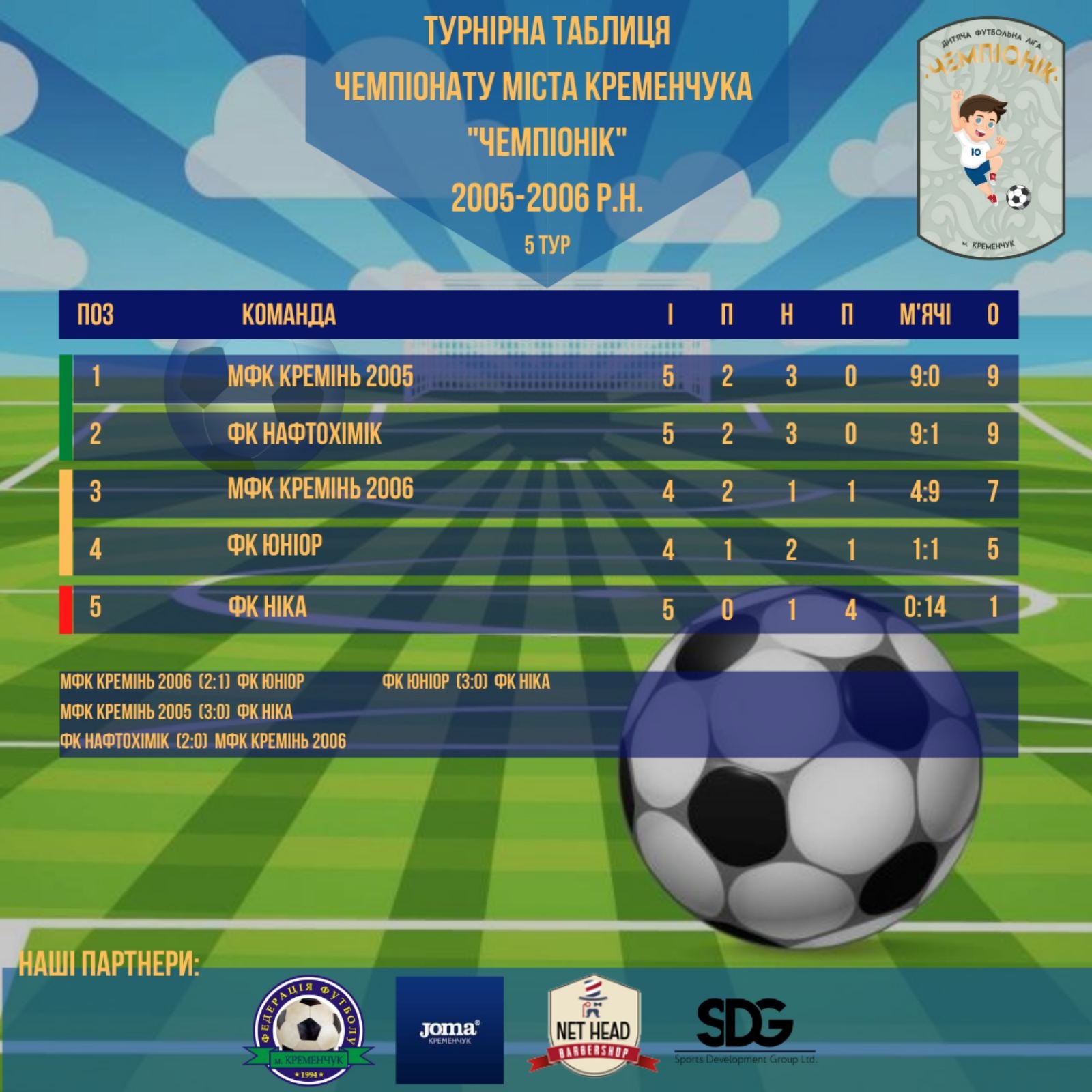 Першу сходинку, після 5 турів, ділять між собою Кремінь 2005 та Нафтохімік.