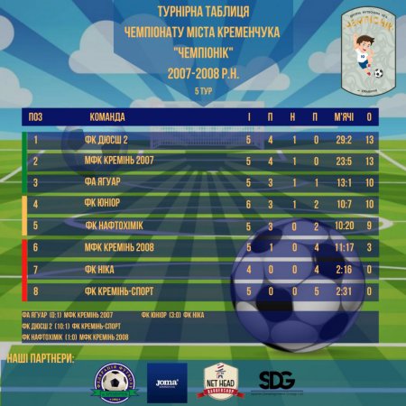 У віковій категорії 2007-2008 грають 8 команд. Після 5 турів турнірну таблицю очолюють ДЮСШ-2 та Кремінь 2007.