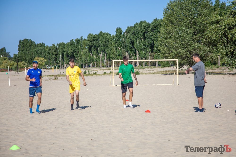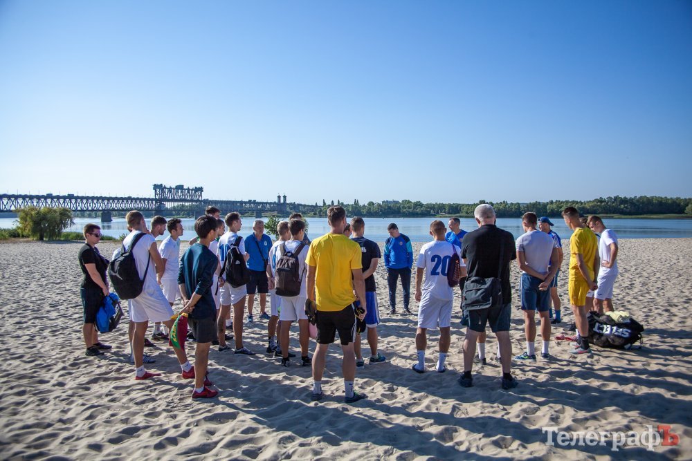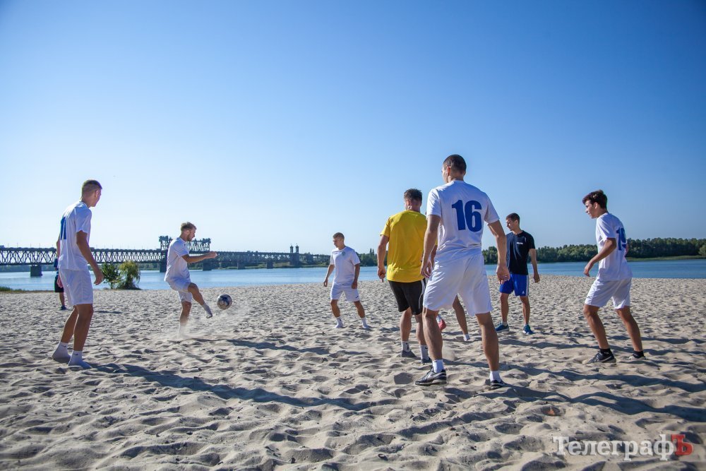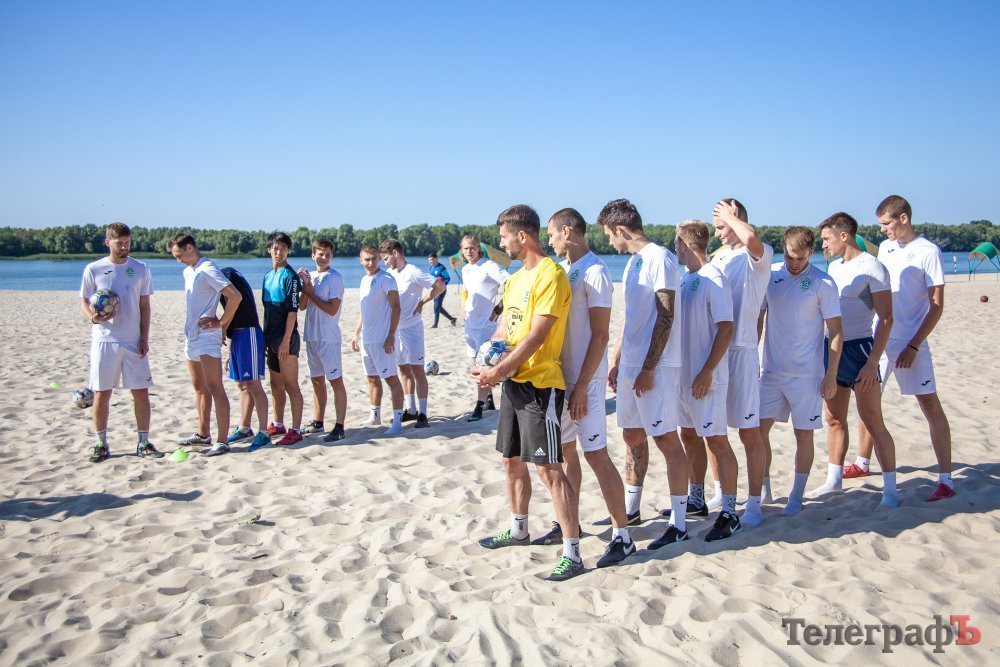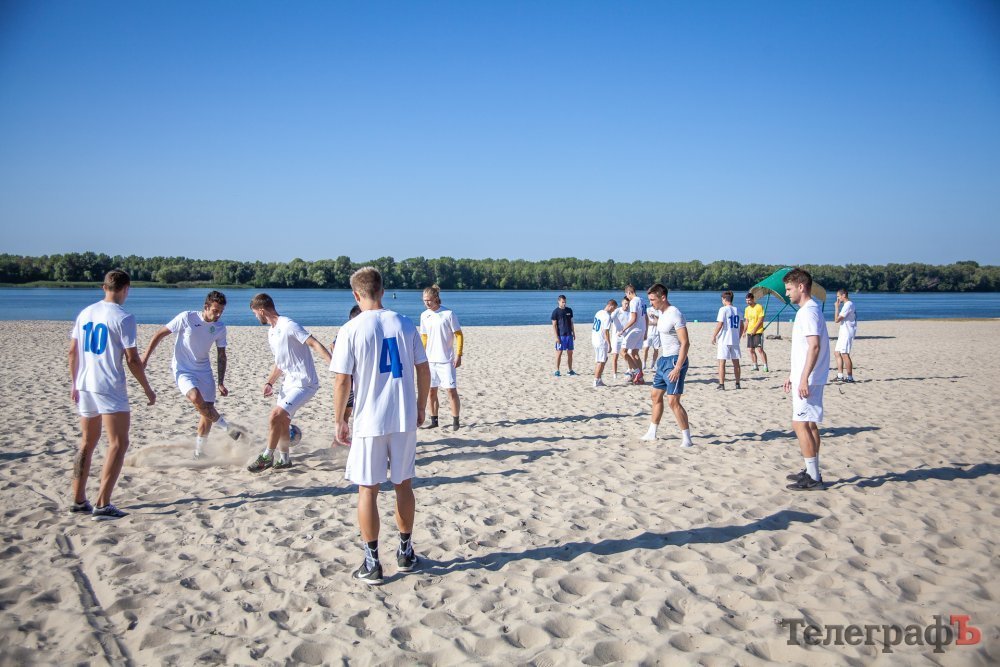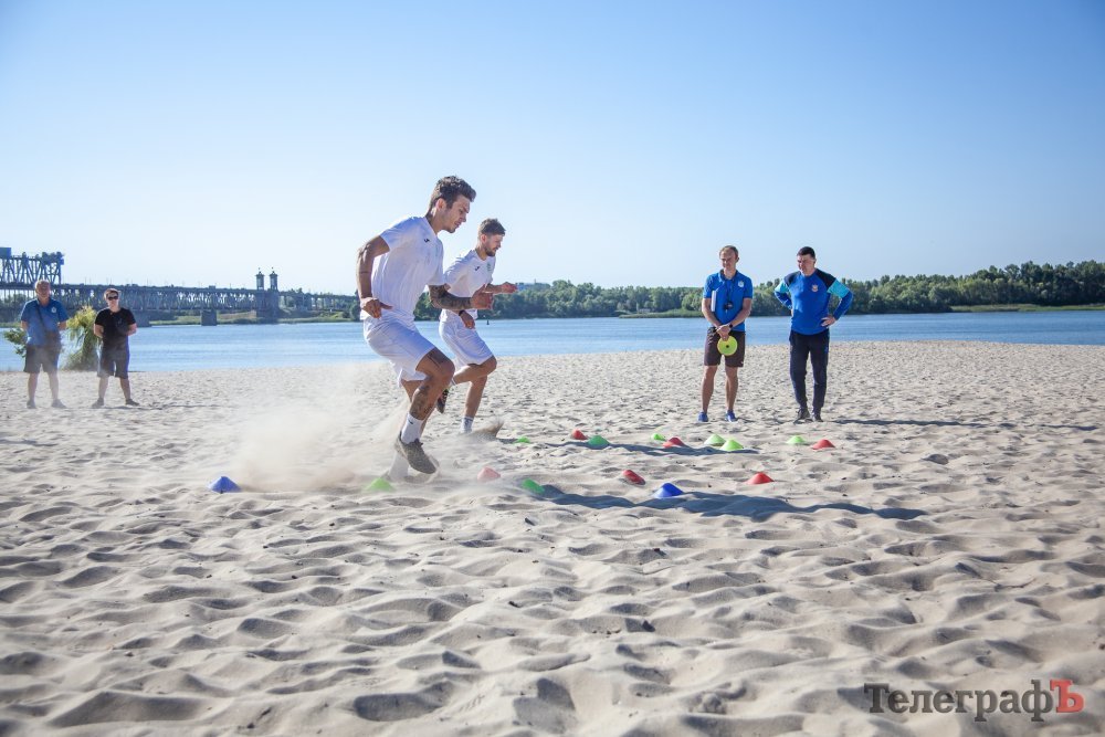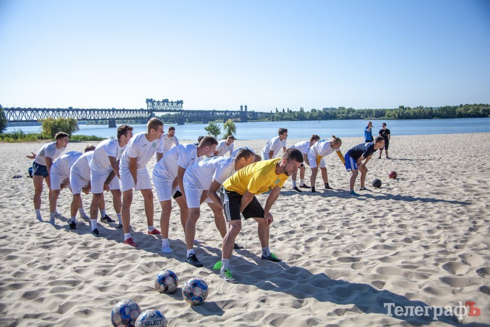 Футболісти «Кременя» сьогодні зранку провели тренування на центральному пляжі Кременчука. Якщо не придивлятися до Крюківського мосту та островів, то можна уявити як кременчуцька команда проводить збір десь на узбережжі Чорного моря.