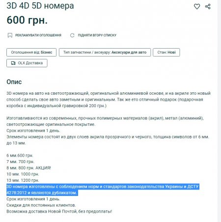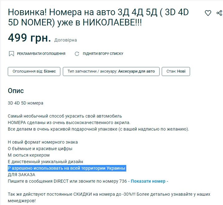 3D номер на авто - такими пропозиціями рясніє один із сайтів купівлі-продажу. Пропонують купити такі об'ємні номерні знаки для того, щоб прикрасити свій автомобіль. Ціни стартують від 350 гривень і сягають тисячі гривень.
