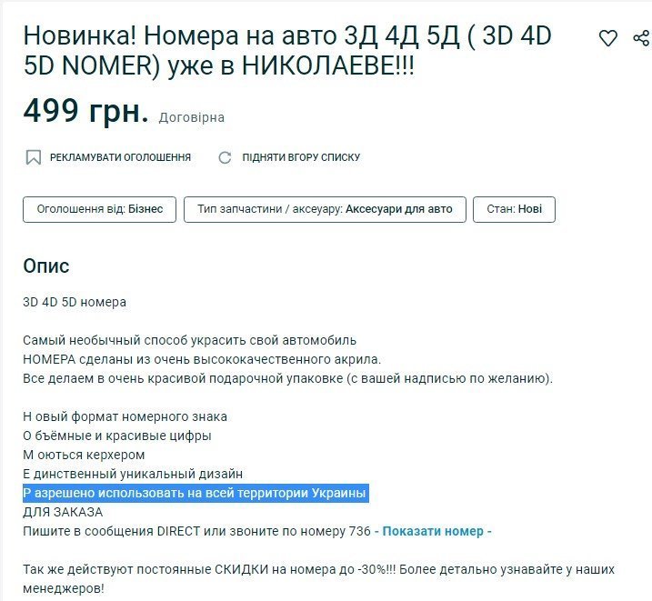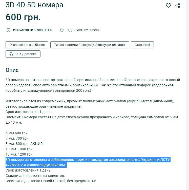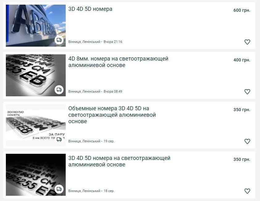 3D номер на авто – такими пропозиціями рясніє один із сайтів купівлі-продажу. Пропонують купити такі об’ємні номерні знаки для того, щоб прикрасити свій автомобіль. Ціни стартують від 350 гривень і сягають тисячі гривень.