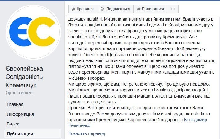 После назначения нового руководителя избирательного штаба в кременчугской парторганизации ЕС состоялось собрание, и глава парторганизации Владимир Пелипенко подписал письмо лидеру ЕС Петру Порошенко. Просит о личной встрече, чтобы рассказать о рейдерском захвате парторганизации людьми Жеваго. Письмо размещено на официальной странице кременчугской парторганизации ЕС. Вот что пишет Пелипенко: