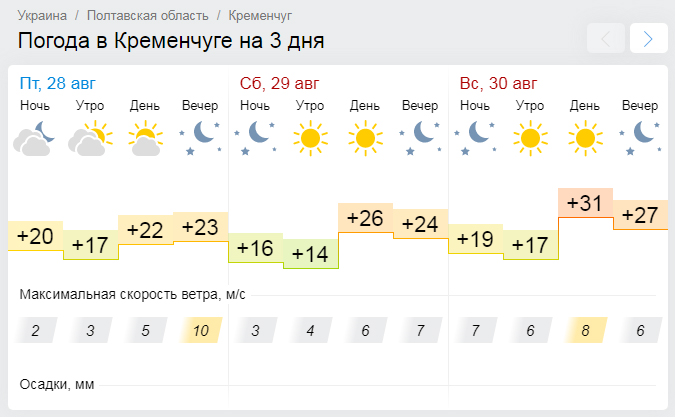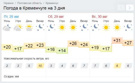 По прогнозам Gismeteo, облака не омрачат неба над Кременчугом, а солнечные лучи будут согревать кременчужан на протяжении всего уикенда, и даже по ночам будет ясно. В субботу, 29 августа, максимум температура поднимется до +26°С, а воскресенье, 30 августа, станет жарким днём – до +31°С.